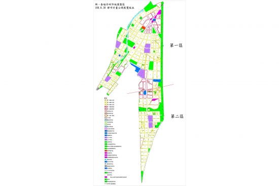 本重劃區總面積概估約122.32公頃。內含2處學校用地、4處公園用地、4處公園兼兒童遊樂場用地、10處綠地兼道路用地、1處廣場兼停車場用地、1處公園兼溝渠用地、1處園道用地、道路用地等共同負擔之公共設施用地,合計面積約48.51公頃,另非共同負擔之公共設施用地包含交通用地及機關用地等,面積為1.22公頃;其餘可建築第三種住宅區及第二種商業區,其他則剔除在重劃區外),合計面積72.60公頃。